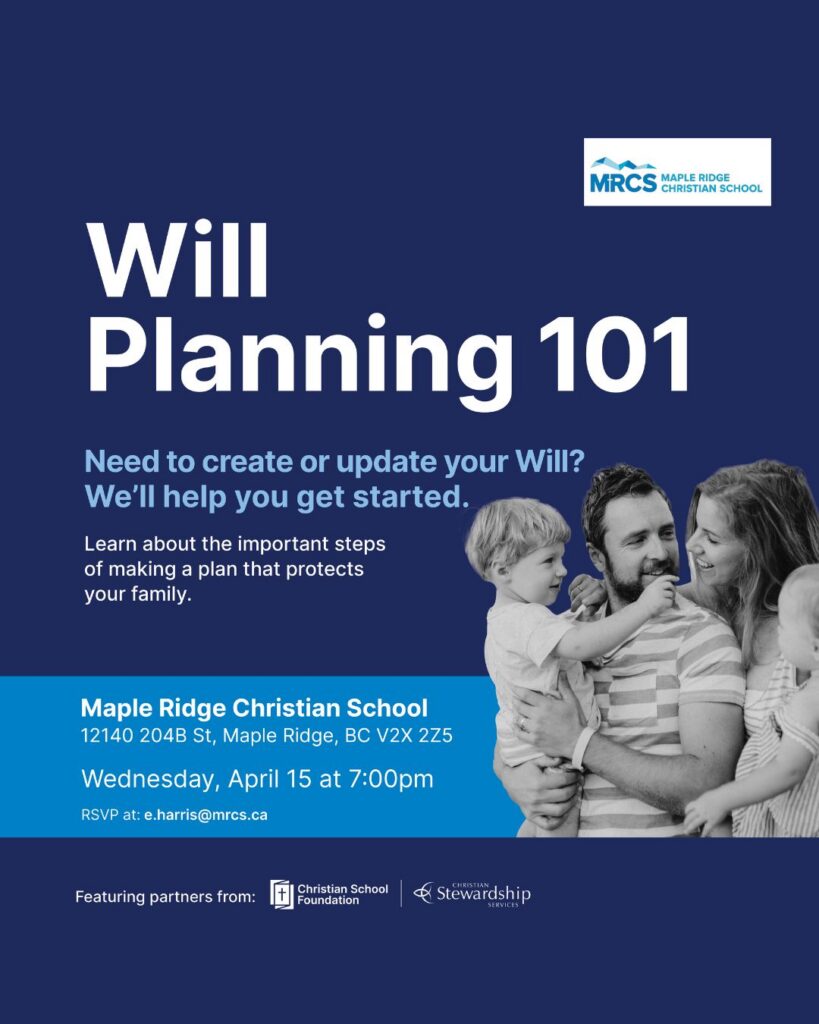 Parents are invited to join us for Will Planning 101 on Wednesday, April 15 at 7:00 PM at MRCS. This informative evening will cover topics such as choosing guardians for your children, naming an executor, and planning for the future. The evening will begin with a dessert social, followed by the presentation.